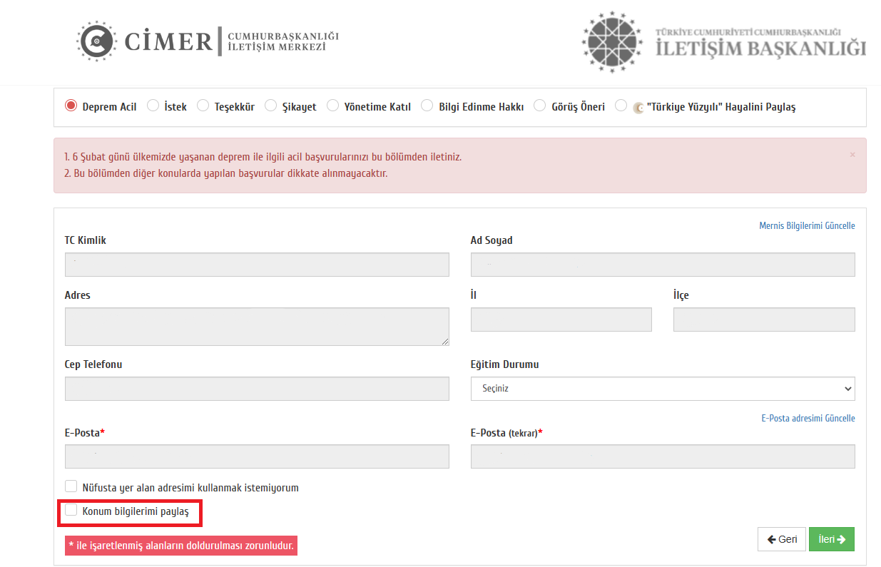 - İhtiyaç durumunuza göre aşağıdaki seçeneklerden Konum bilgilerimi paylaş butonunu işaretleyip ileri butonuna basınız ve başvuru metninizi yazınız.