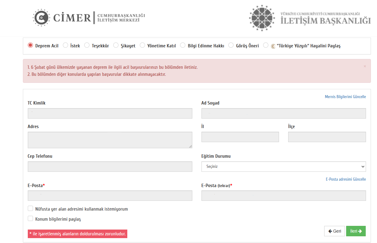 Cumhurbaşkanlığı İletişim Başkanlığı'na bağlı olarak oluşturulan CİMER'e ''deprem acil'' seçeneği eklendi.