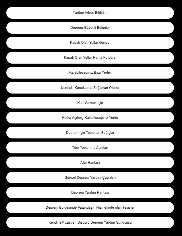 Ülkemizde yaşanan deprem afetiyle ile ilgili bir çok veri ve iletişim seçenekleri bir yerde toplanıldı. Buraya tıklayarak bağlantıya ulaşabilirsiniz.